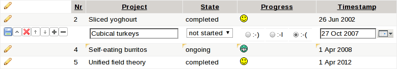 %EDITTABLE{ format="| row, -1 | text, 20, init | select, 1, not started, starting, ongoing, completed | radio, 3,:-),:-I,:-( | date, 20 |" changerows="on" quietsave="on"}%